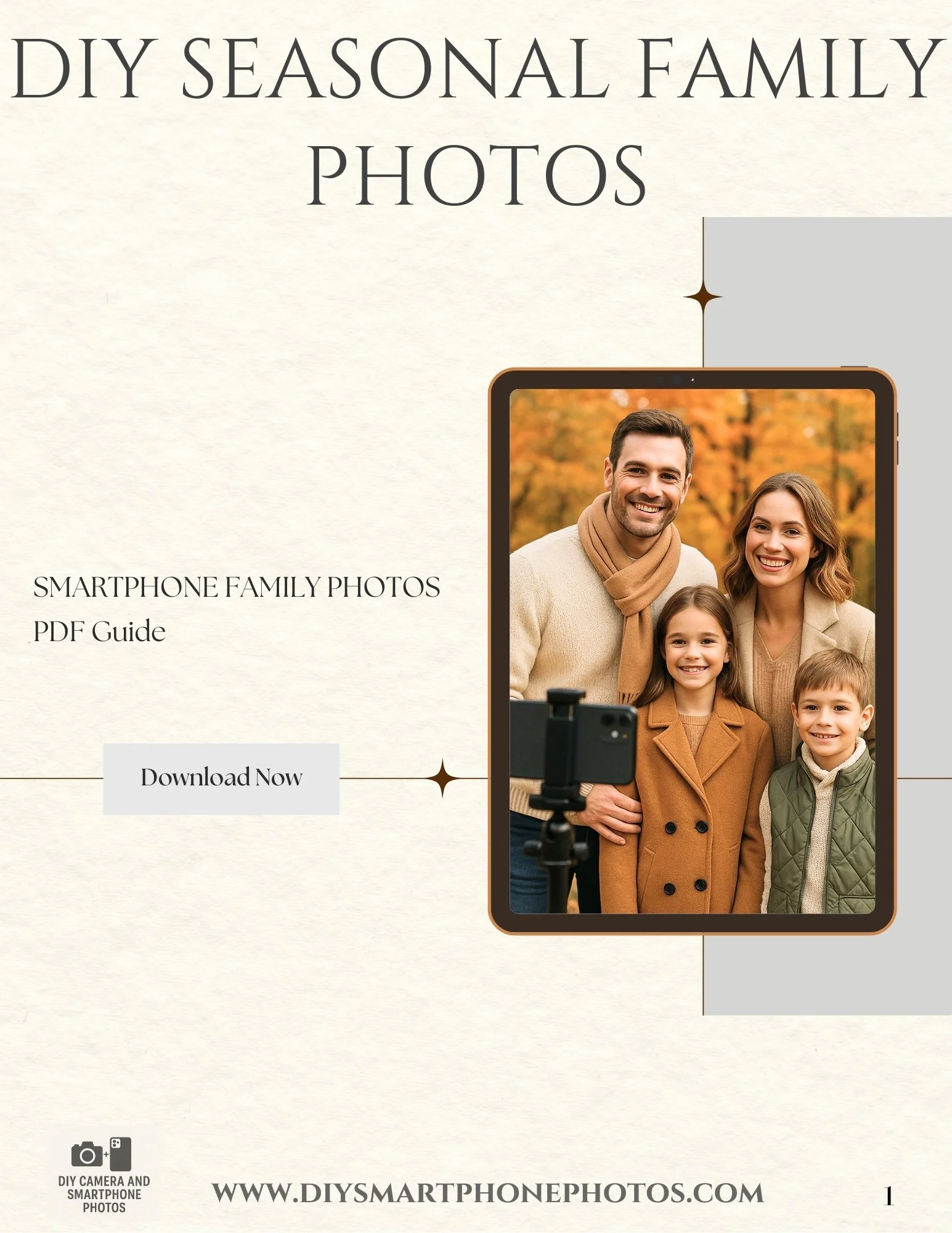 Are you looking for a reasonably priced photographer that won’t break the bank? Do you need your annual family pictures, but don’t have much time? This guide has been created by a professional photographer for parents who are looking for family photos, but feel they can do it themselves with a little help. This How To DIY Family Photos guide will walk you through iphone settings, wardrobe, print options, tips on smiling and posing. It’s all yours and it’s currently on sale for $5. www.diysmartphonephotos.com